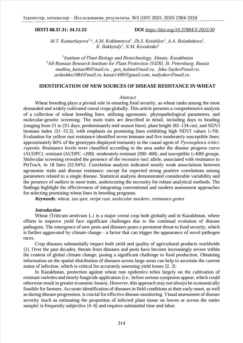 - Malysheva A.A., Kokhmetova A.M., Kumarbayeva M.T., Zhanuzak D.K., Bolatbekova A.A., Keishilov Zh.S., Gultyaeva E.I., Kokhmetova A.M., Tsygankov V., Dutbayev Y.B., Dubekova S.B. Identification of Carriers of Puccinia Striiformis Resistance Genes in the Population of Recombinant Inbred Wheat Lines // International Journal of Biology and Chemistry. – – Vol. 15(1). – P. 4-10. DOI: 10.26577/ijbch.2022.v15.i1.01. IF – 0.3. WOS Q4.