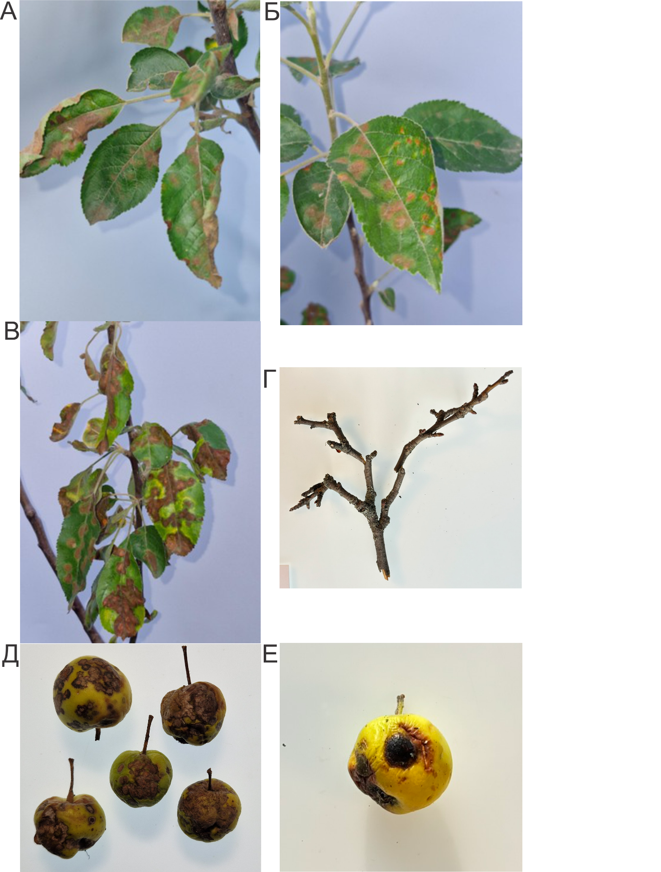 1-сурет – Malus туысына жататын өсімдіктердің Venturia inaequalis және Erwinia amylovora фитопатогендерімен зақымдану симптомдары.