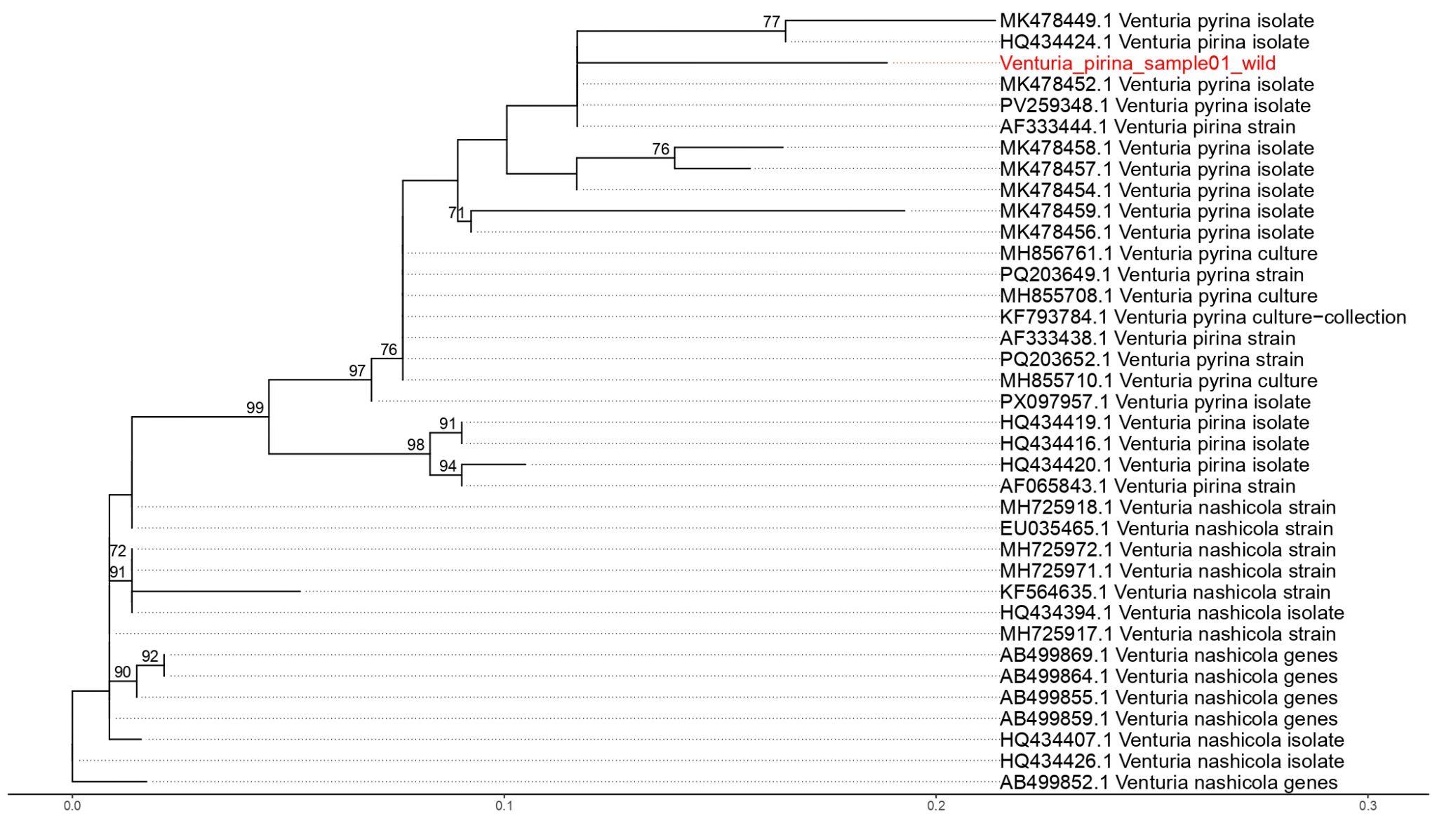 - Kostyukova, V.; Pozharskiy, A.; Khusnitdinova, M.; Nizamdinova, G.; Gritsenko, D. Morphological and Molecular Characterization of Apple Scab (Venturia inaequalis) in Kazakhstan and Kyrgyzstan. Curr. Issues Mol. Biol. 2025, 47, 1011. https://doi.org/10.3390/