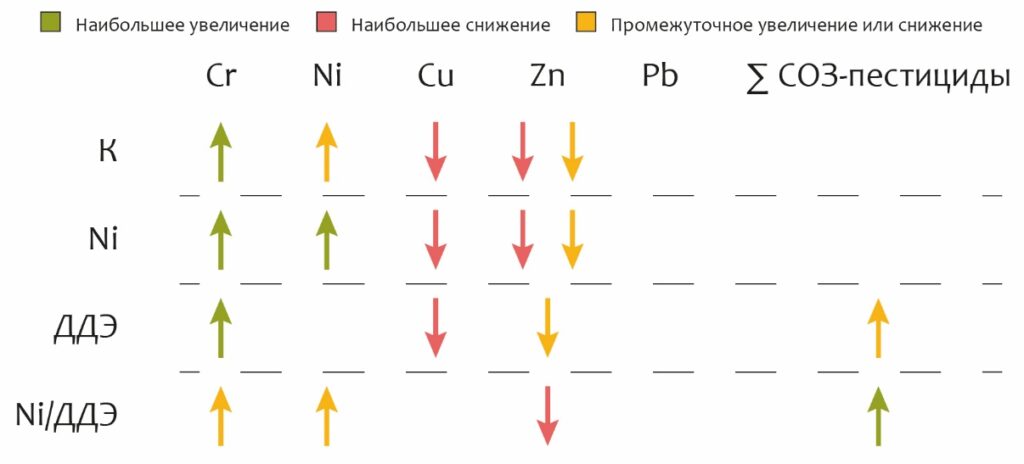 Analysis of the dynamics of POP-pesticide content in DDE-contaminated soil before and after the vegetation period of M. sinensis showed a 39% decrease in their bioavailability to plants, whereas under single DDE contamination the decrease reached 59% relative to the initial value (Fig. 1).