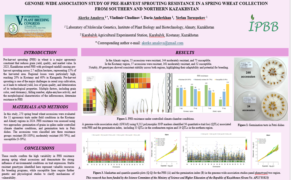 - Amalova A., Chudinov V., Anderkhan D., Turuspekov Y. Genome-wide association study of pre-harvest sprouting resistance in a spring wheat collection from southern and northern Kazakhstan // 5th International Plant Breeding Congress (Turkey). – 2025 (постер)