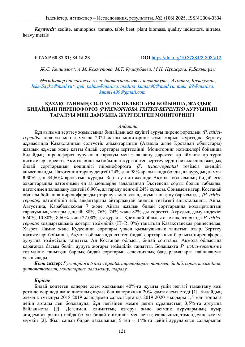 - Keishilov Zh., Kokhmetova A., Kumarbayeva M., Nurzhuma M., Bakhytuly K. (2025). Monitoring of the distribution and development of tan spot (Pyrenophora tritici-repentis) of spring wheat in the northern regions of Kazakhstan. Izdenister Natigeler, 2(106), 121–131. https://doi.org/10.37884/2-2025/12