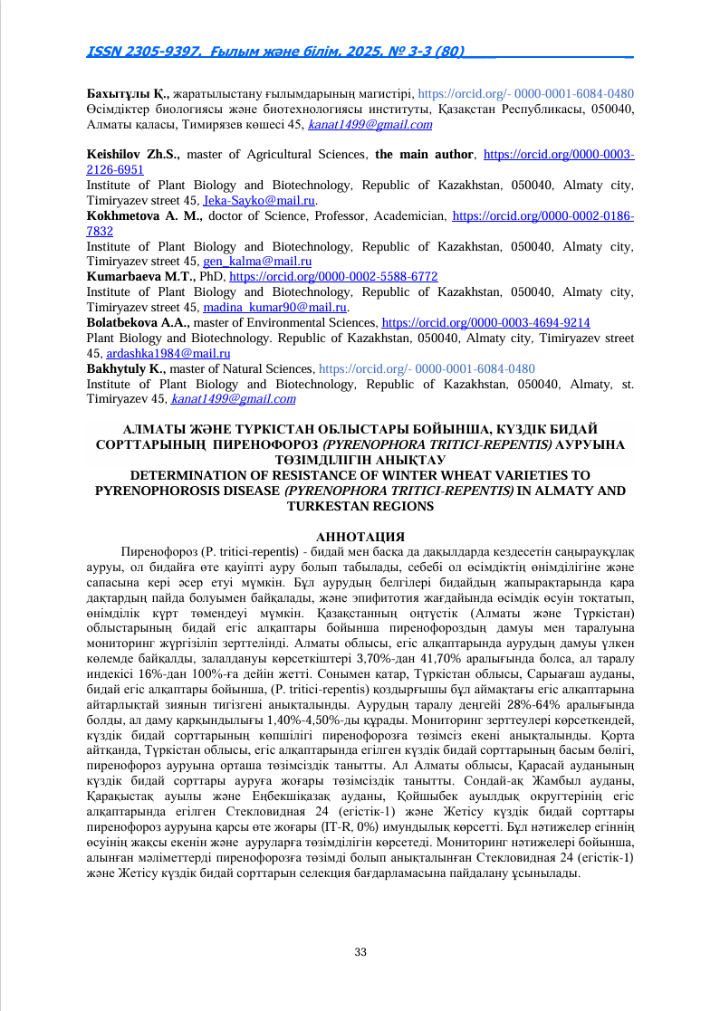 - Кеишилов Ж.С., Кохметова А.М., Кумарбаева М.Т., Болатбекова А.А.,Нұржұма М.Н. Қазақстанның солтүстік және оңтүстік облыстары бойынша, бидайдың пиренофороз (pyrenophora tritici-repentis) ауруына жүргізілген мониторингі // «Ізденістер, нәтижелер-Исследования, результаты», –Алматы, 2024. № 2 – 74-84 бет. (ККСОН МОН РК). DOI: https://doi.org/10.37884/2-2024/08 КОКНВО