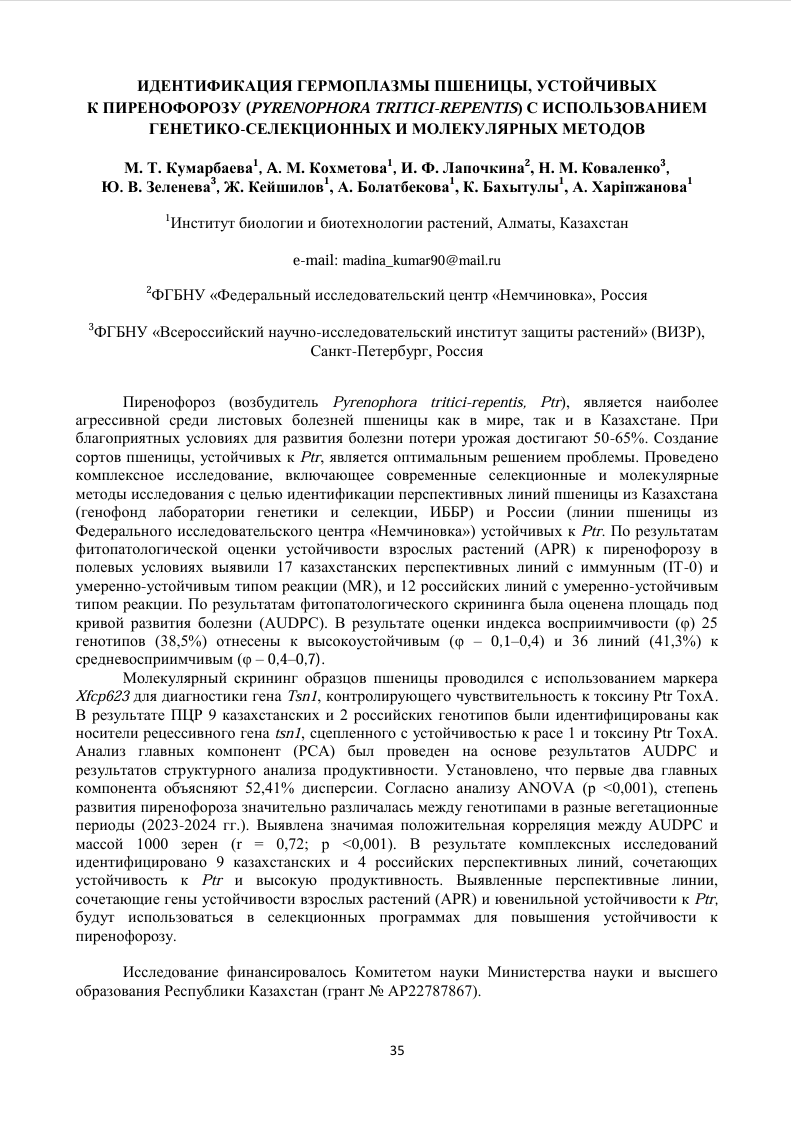 - Kumarbayeva M. T., Kokhmetova A. M., Lapochkina I. F., Kovalenko N. M., Zeleneva Yu. V., Keishilov Zh., Bolatbekova A., Bakhytuly K., Kharipzhanova A. Identification of wheat germplasm resistant to tan spot (Pyrenophora tritici-repentis) using genetic, breeding, and molecular approaches. In: Proceedings of the V International Scientific and Practical Conference “Current Problems of Plant Immunity to Harmful Organisms”. Saint Petersburg: All-Russian Institute of Plant Protection (VIZR), 2025, 35 p.