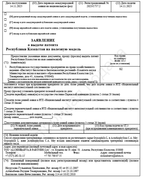 Мурсалиева В.К., Муханов Т.М., Алғазы А.Т., Сәрсенбек Б.Т., Гемеджиева Н.Г. Способ определения тритерпеновых сапонинов в экстрактах из растительного сырья Gypsophilla L. и Acanthophyllum C.A. Mey. Рег. № 2025/1757.2 от 14.11.2025 г.